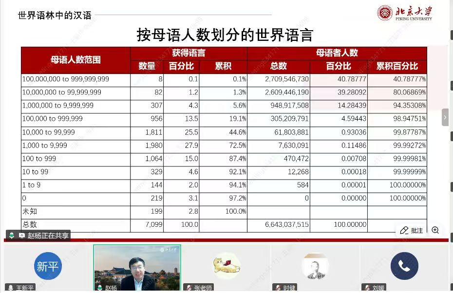 2025年11月25晚7时,北京大学二级教授、博雅特聘教授、对外汉语教育学院院长、剑桥大学博士赵杨教授,应澳门正规电子游戏平台邀请,在线举办了题为《中国语言文化传播的历史与现状》的学术讲座。本次讲座由院长王新平主持,全院师生120多人在线聆听报告。赵杨教授的讲座从全球视角考察中文的地位以及中文作为二语和外语的传播,涉及世界语林中的汉语、世界知识的语言表达和中文的教学与传播,讨论基于语言传播而开展的文明交流互鉴...