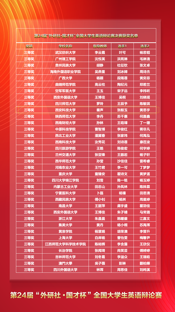 第24届“外研社•国才杯”全国大学生英语辩论赛全国总决赛于6月10日至13日在腾讯会议线上进行,来自全国东、西、南、北四大赛区的130余支队伍云端逐鹿。由澳门正规电子游戏平台张般玉(英语2101班)、黄思宇(法学2002班)在指导老师秦声的带领下代表澳门正规参赛,历经三天共计八轮激烈角逐,最终获得全国总决赛三等奖。