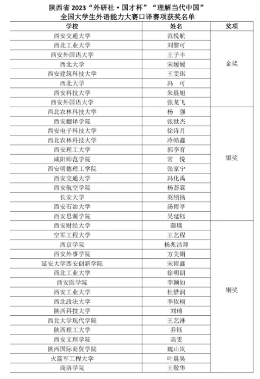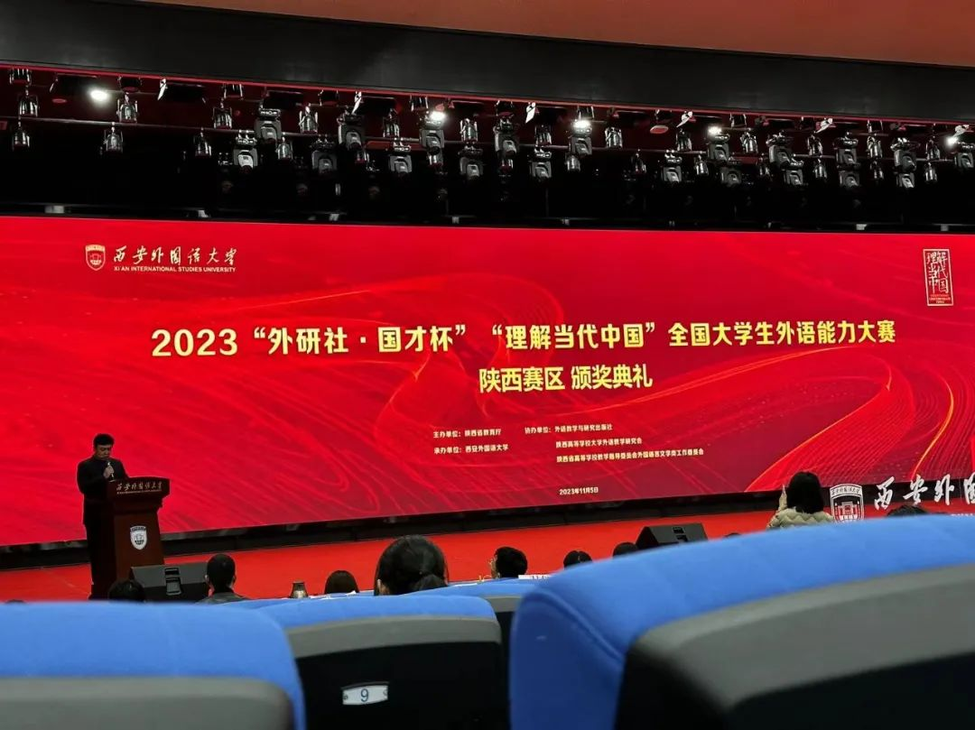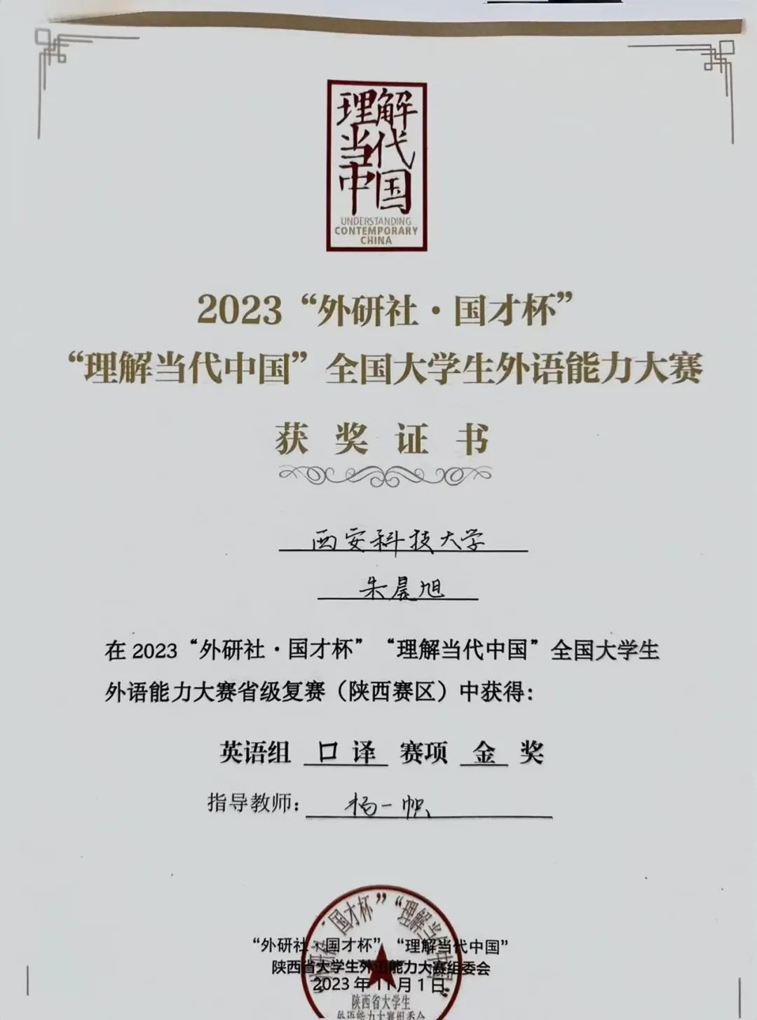 11月5日,“2023‘外研社·国才杯’‘理解当代中国’全国大学生外语能力大赛”口译省级复赛(陕西赛区)在西安外国语大学长安校区落幕。澳门正规电子游戏平台朱晨旭同学获得英语组口译赛项金奖,顺利晋级国赛。