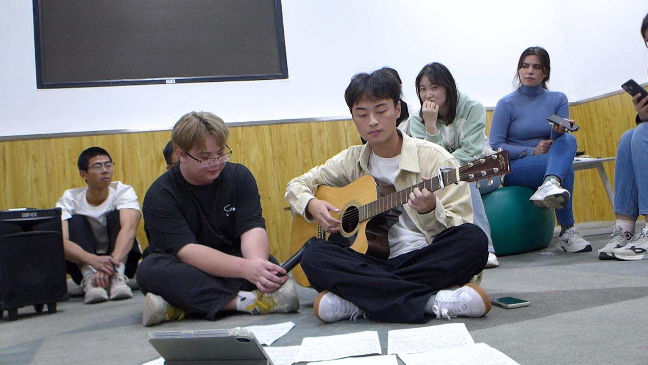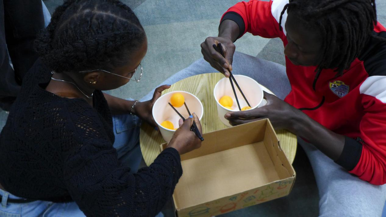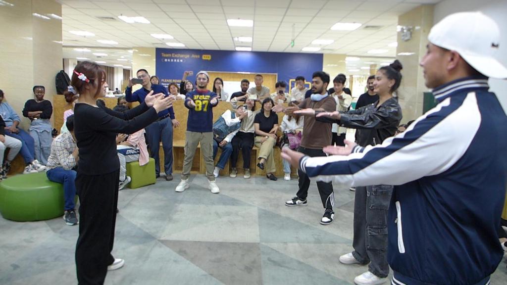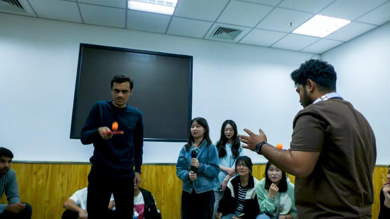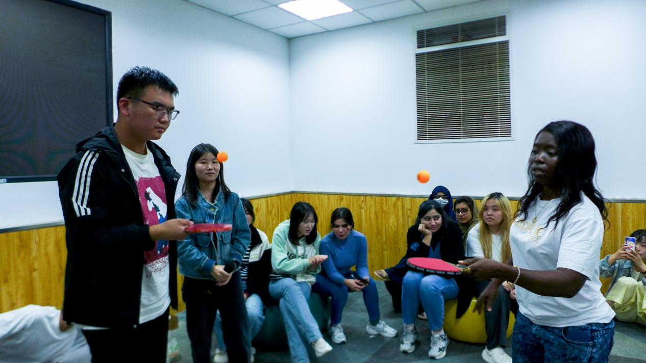 随后,英语专业学生和国际留学生分别通过奥运知识问题抢答、夹乒乓球、乒乓球颠球等形式,加强互动交流、深入探讨“College Life and Sports ”。英语专业学生林冰宴为大家带来了精彩的五禽戏表演,留学生们也在林冰宴的带领下积极参与到五禽戏的体验活动中。以及英语专业学生田子齐为大家带来了精彩的吉他弹唱。