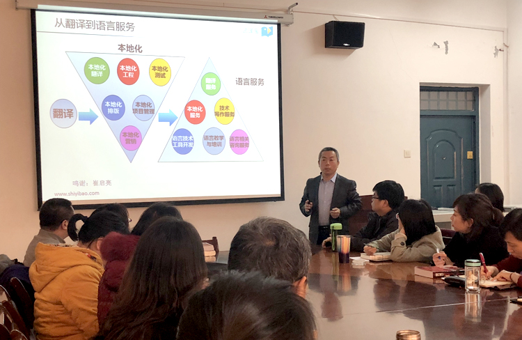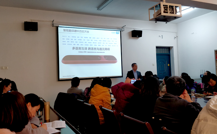 12月10日下午,澳门正规电子游戏平台在学院会议室举办新时代翻译教育及人才培养专题学术讲座。语言服务行业专家、试译宝总经理师建胜应邀以《人工智能时代的翻译教育与翻译人才能力培养》和《人工智能如何助力翻译教学和科研》为题,介绍了语言服务行业的最新发展趋势,分析了人工智能技术对翻译教育的冲击,探讨了新技术背景下翻译人才综合素质的养成,并对翻译专业学生提出了发展建议。结合翻译的教学与研究,师建胜讲解了人工智能的基本原理和人机结合模式及其应用场景,讨论了如何将人工智能应用于翻译教学和科研中,并回答了师生的提问。报告会由人外学院院长师新民主持,学院英语教师代表和2019级MTI研究生聆听了报告。