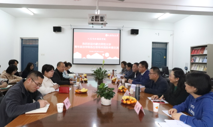 1112日下午,内蒙古师范大学青年政治学院教务处处长张利峰、基础教育系主任呼和、管理系主任文良、信息工程系主任尤文静、汉语言文学系主任伍涑华、外语系旅游英语教研室主任刘琼等一行来院交流,并与我院院长师新民、英语系主任张芸、汉语言文学系主任张辉及学生代表进行了座谈。