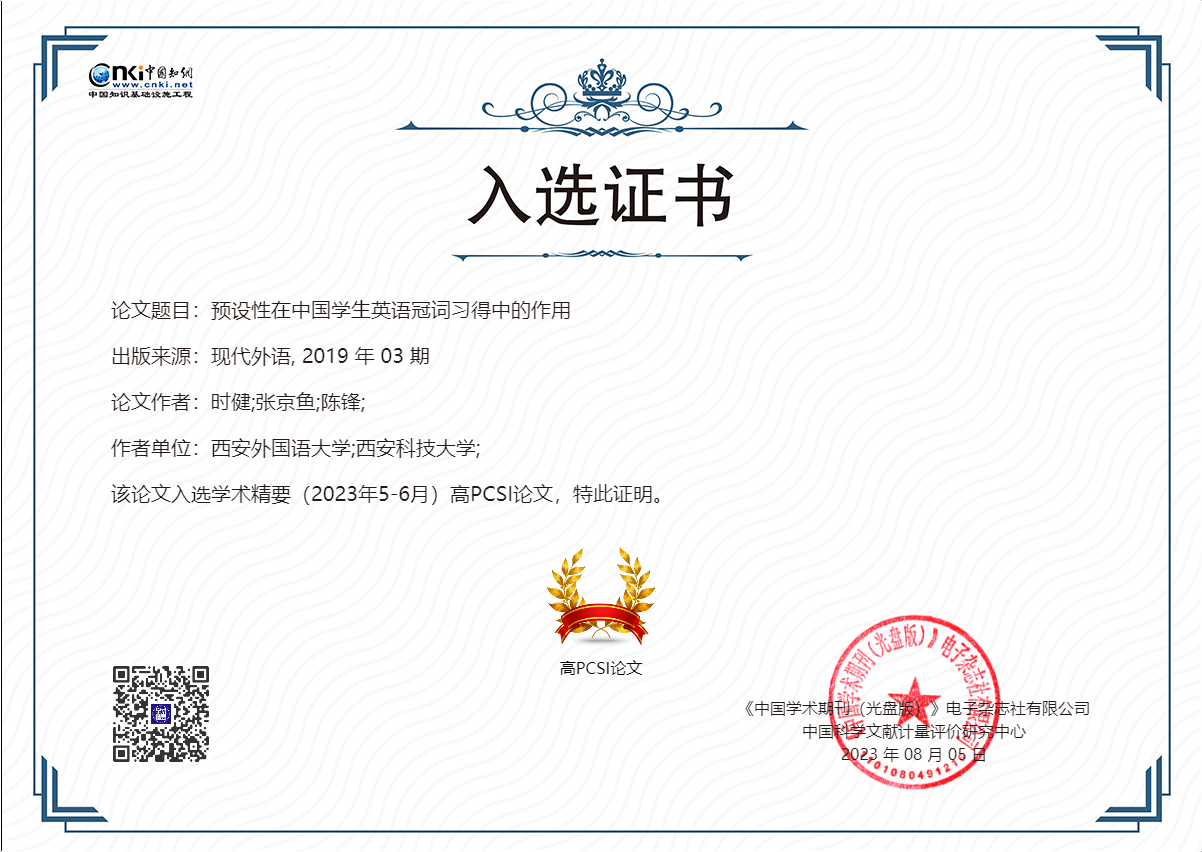 2023年8月5日,我院时健副教授发表的一篇论文获得中国知网(2023年5-6月)高PCSI论文。高PCSI论文是在某一年度内,同学科同类型文献(如研究型论文)中,根据PCSI(Publication Citations per Service Item,出版服务单位每项指标的引用次数)指数排名的前1%的论文。另外,该论文曾获2021年陕西高校人文社科研究优秀成果三等奖。