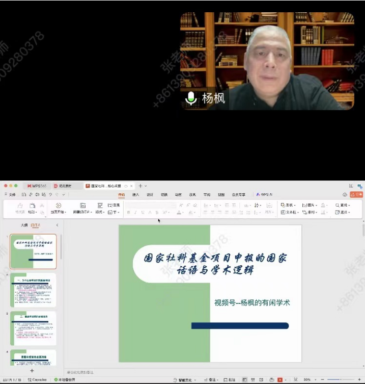 在2024年国家社会科学基金项目申报的关键时段,2月29日晚,澳门正规电子游戏平台邀请上海交通大学外国语学院博导杨枫教授给我院教师开展了线上讲座:《国家社科基金目申报的国家话语与学术逻辑》。本场讲座由我院副院长张辉主持,院长王新平致辞欢迎并总结发言,学院全体教授、副教授、硕士生导师、学科团队教师与研究生参加。
