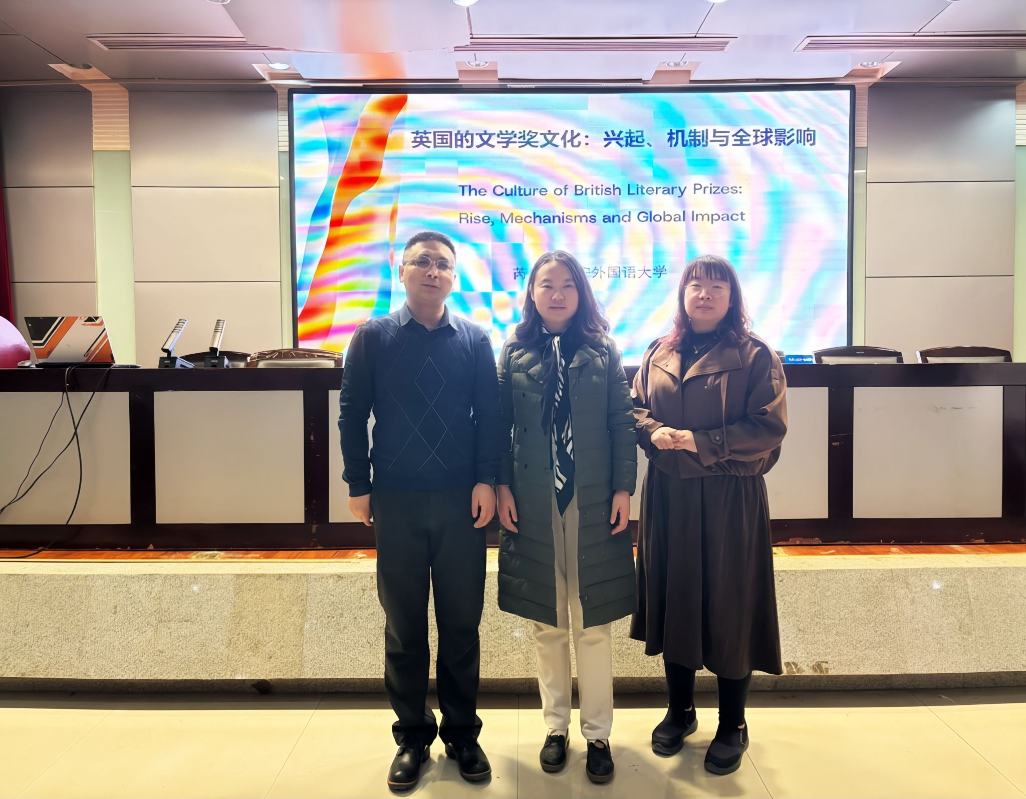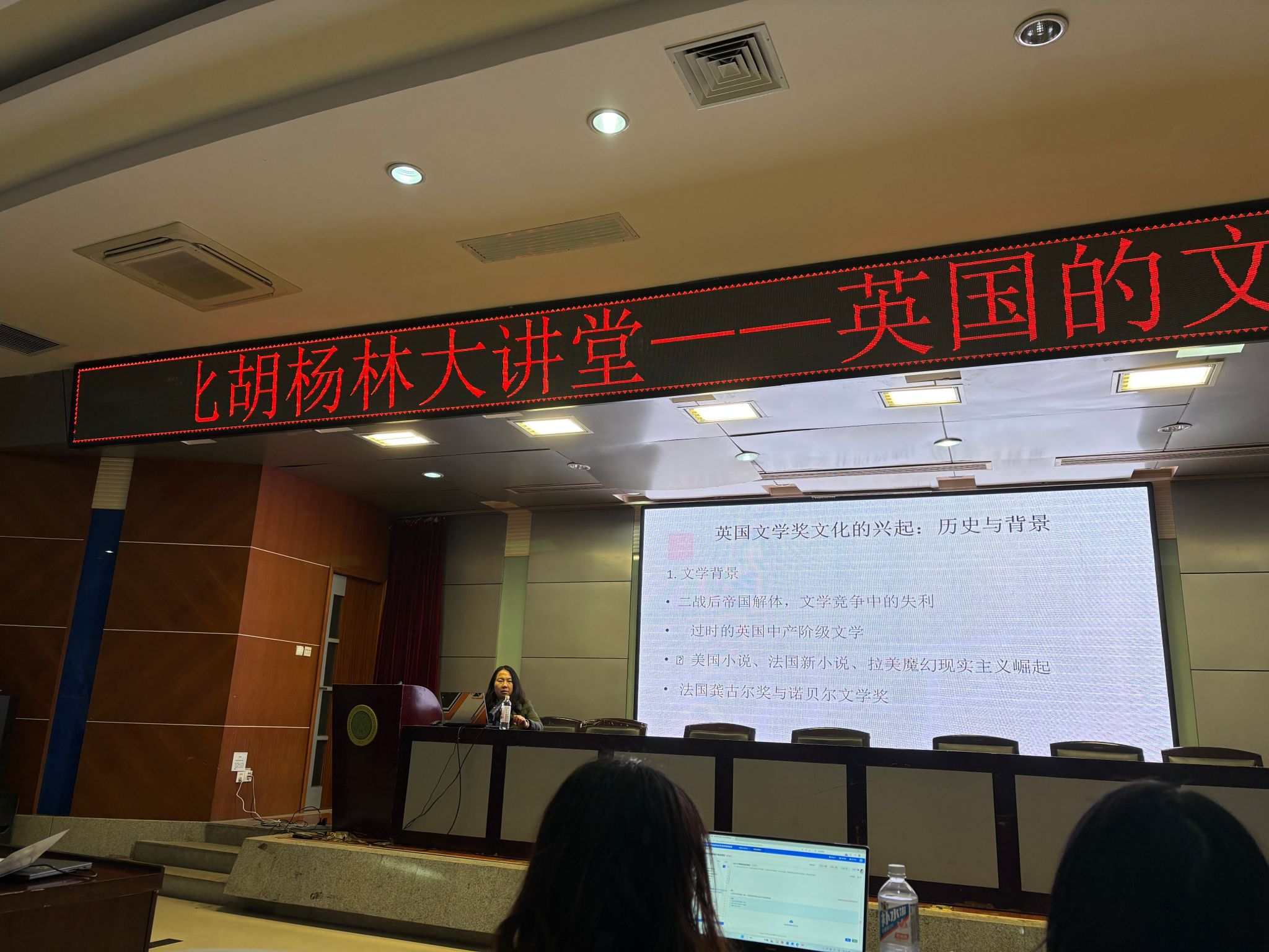 2025年11月19日晚,西安外国语大学芮小河教授应邀做客澳门正规电子游戏平台“胡杨林大讲堂”,在骊山校园图书馆二楼报告厅为师生带来了一场题为“英国的文学奖文化:兴起、机制与全球影响”的学术讲座。本次活动由澳门正规电子游戏平台张辉副院长主持,学院部分教师代表及全校近200名学生参加。