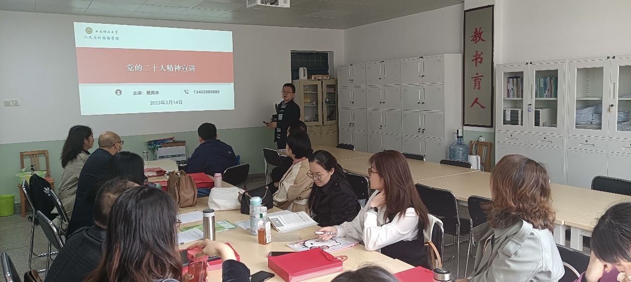 为深入学习宣传贯彻党的二十大精神,3月14日下午,学院党委书记费秀水为大学英语教学一部党支部全体党员作“学习宣传贯彻党的二十大精神”专题宣讲。大学英语教学一部党支部全体党员参加,党支部书记张剑锋主持会议。
