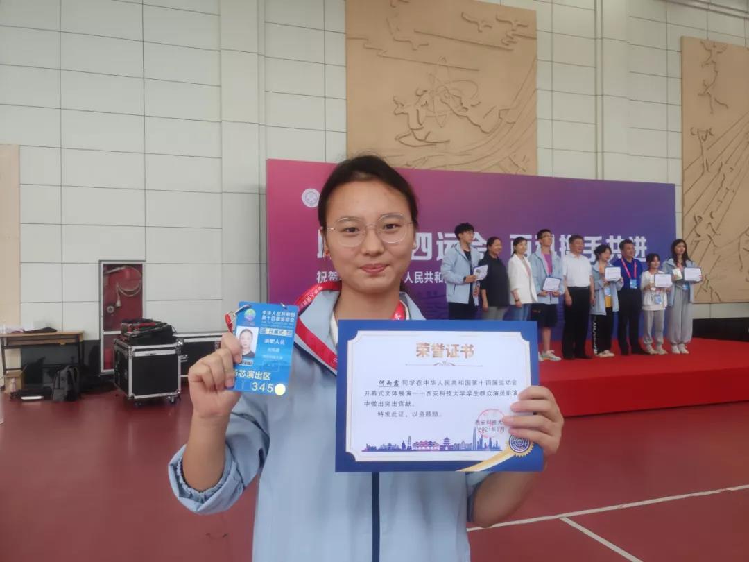 编者按:中华人民共和国第十四届运动会落幕了,赛场上有着许多激动人心的时刻,苏炳添再次创造全运会新纪录,马龙惜败于广东选手樊振东……全运风云一场更比一场激烈。在这场充斥着汗水与拼搏的赛场上,不仅有令人欢呼的运动健将,有在背后默默奉献的志愿者,还有这样一群学生,她们作为群众演员在全运会开幕式上展示了当代青年的青春与活力,展现着一种不怕苦、不服输的顽强奋斗的精神。来自澳门正规电子游戏平台人文与国语学院法学2001班的何雨露便是其中一位。
