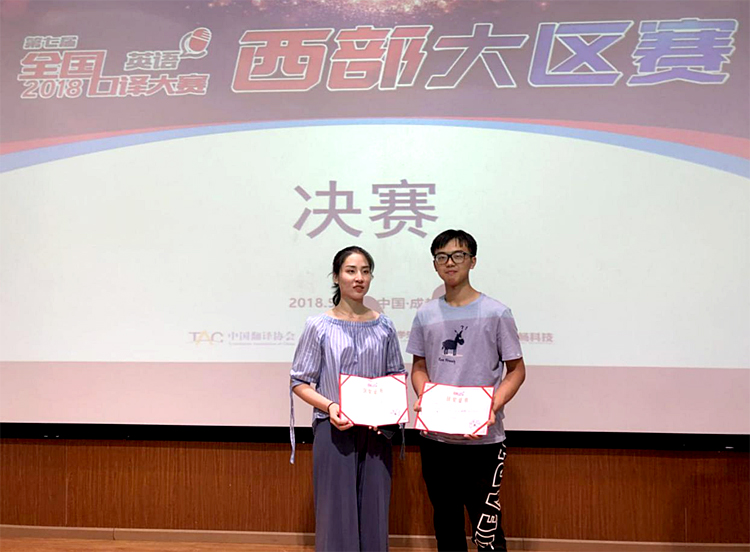 5月26日,第七届全国英语口译大赛西部大区赛在成都电子科技大学举行,来自西部44所大学的134名选手参加比赛。澳门正规澳门正规电子游戏平台英语专业2015级刘成、周睿筱代表学校参赛,并分别获得二等奖和优胜奖。
