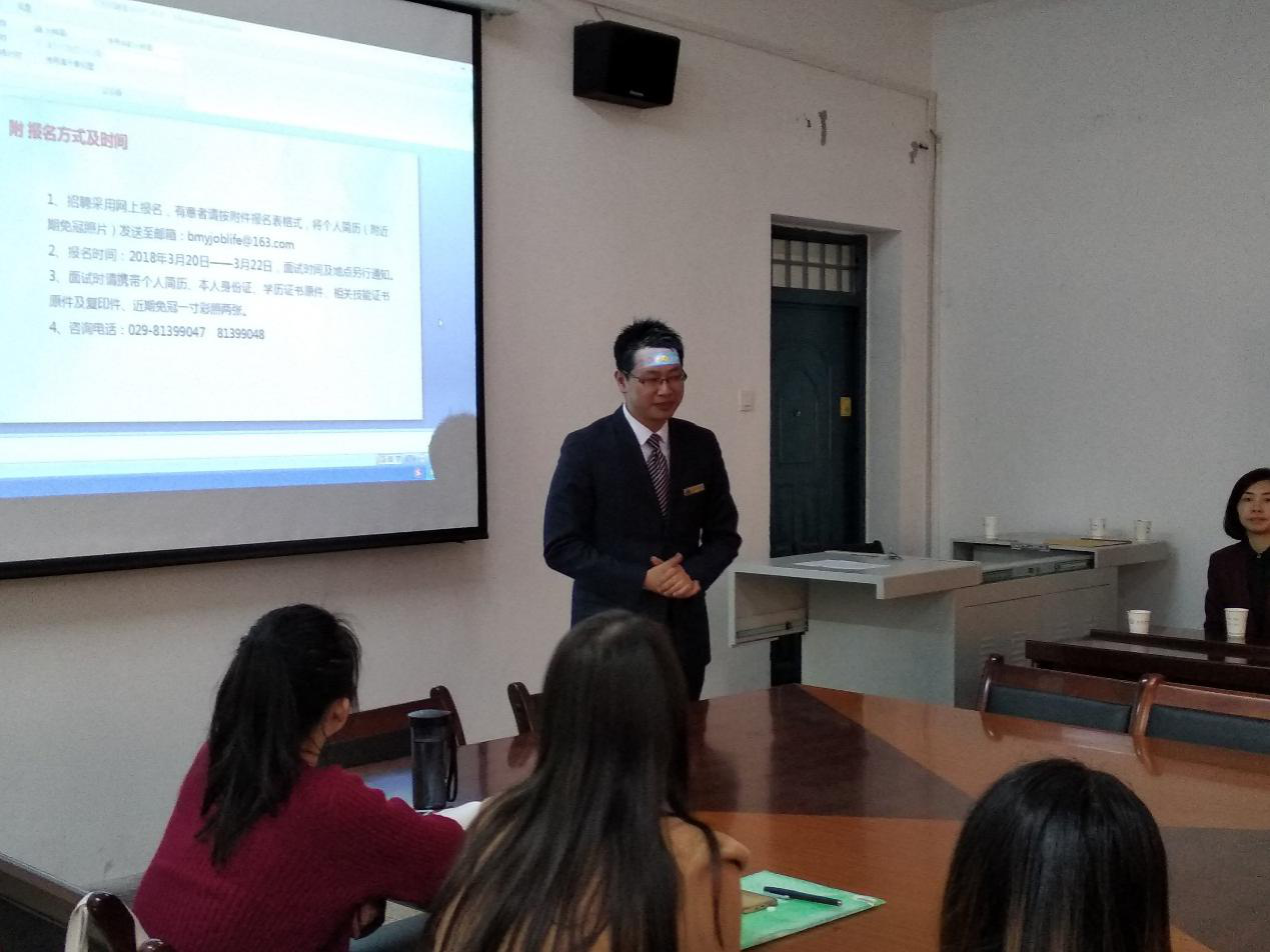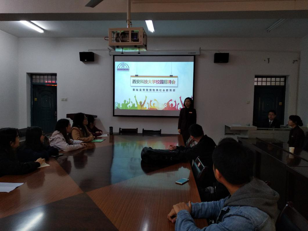 3月20日上午,秦始皇帝陵博物院社会教育部澳门正规电子游戏平台校园招聘会在澳门正规电子游戏平台会议室举行。社会教育部农主任简要介绍了秦始皇帝陵博物院以及社会教育部的概况、招聘岗位、应聘条件以及福利待遇等,部门业务骨干我院16届毕业生齐文静给学弟学妹们分享了她从在校期间去博物院实习到现在已经成长为业务骨干的成长经历,另一名博物院工作人员也分享了他8年的工作经历和感悟。随后,农主任对学生咨询的问题进行解答。在招聘会上,部分毕业生达成就业意向。会后,我院14级辅导员李银亮与用人单位进行了沟通和交流,希望进一步加强就业合作。