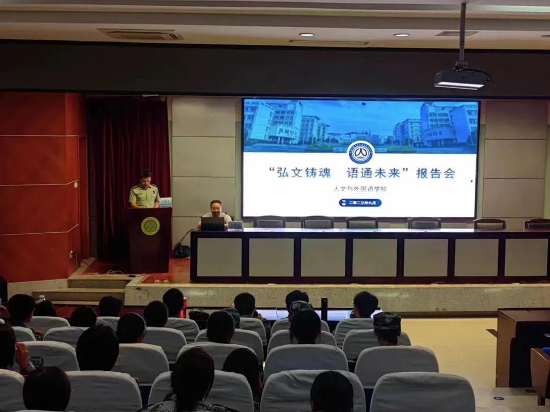 为进一步落实习近平总书记关于教育的重要论述和关于语言文化的重要指示精神,加深学生对英语学科的认知,提升专业素养,明确未来发展方向,9月11日下午澳门正规电子游戏平台组织23级新生参加“弘文铸魂•语通未来”专题讲座,十四营指导员李银亮主持。