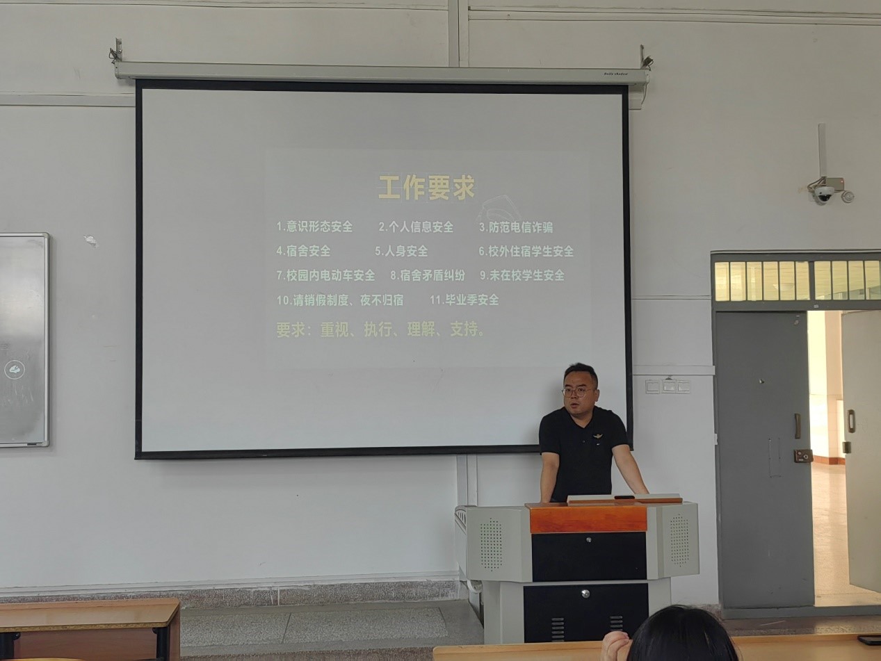 会议强调了意识形态安全、宿舍安全、防范电信诈骗、个人人身财产安全、校园内交通安全等,要求全体毕业班学生要提升纪律意识,严格请销假制度,杜绝夜不归宿等现象。