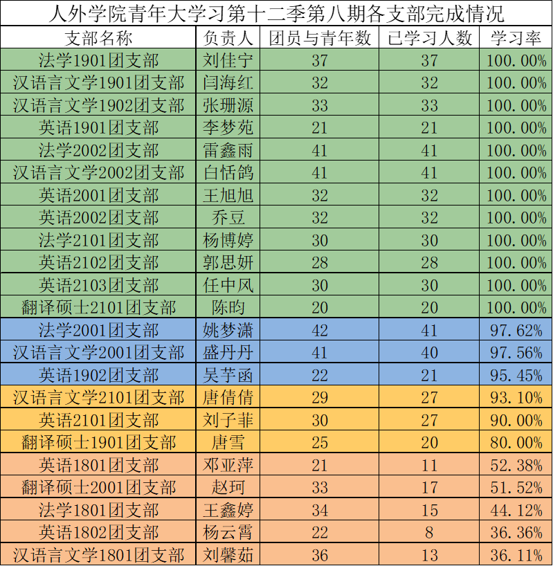 在本次青年大学习中,共有12个团支部青年大学习完成率达到100%,位于90%至100%的团支部有6个,总体而言进步显著,但仍有5个团支部青年大学习完成情况不理想,与其他团支部差距较大,在此希望各团支书督促同学们及时完成青年大学习。