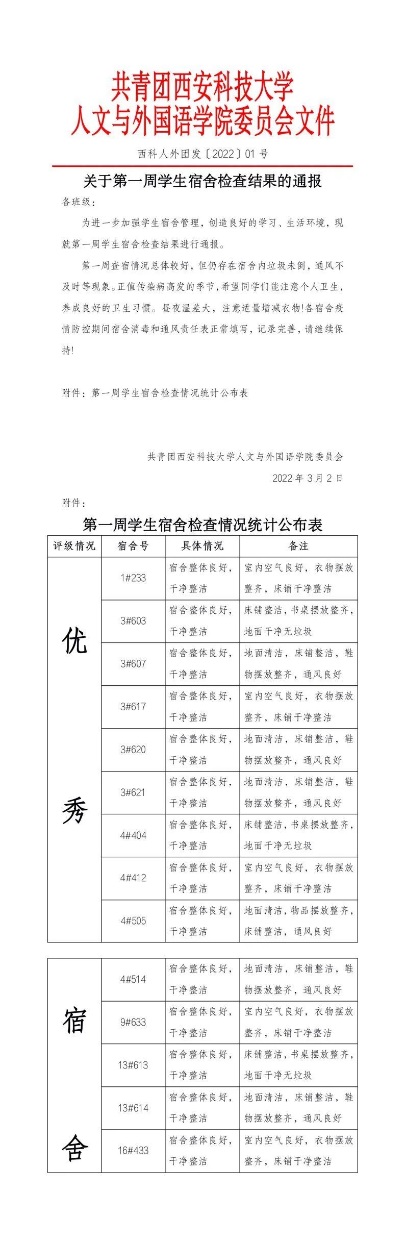 充实的校园生活当然离不开宿舍卫生这一环,通过卫生检查为契机,齐心协力把宿舍卫生环境工作提高到一个新水平,使宿舍达到“亮、净、美”的效果,确保学生在学校健健康康生活而奠定坚实的基础。本次宿舍卫生检查汇总如下: