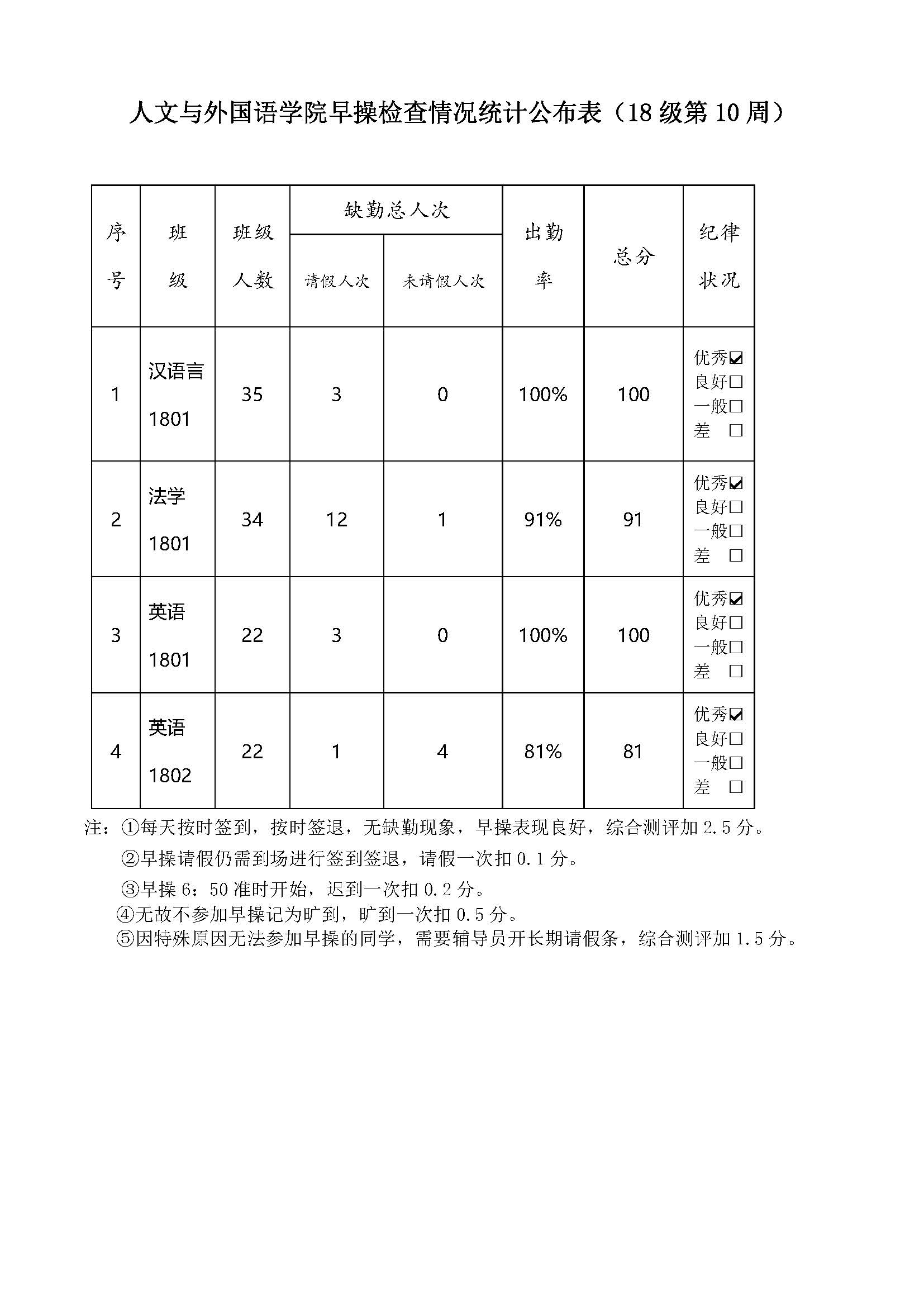 澳门正规电子游戏平台早操检查情况统计公布表(18级第10周)