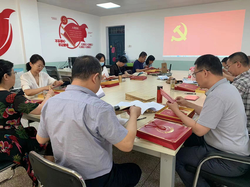 英语系支部统一印制了党员“政治生日”礼物,包括“一份纪念册,一枚党徽、一页书签、一支钢笔、一个笔记本”。在集体唱完国歌后,支委委员杜戍涓和史凤玉把礼物送到每位党员手中。支部书记时健带领大家面对党旗,庄严地重温了入党誓词。
