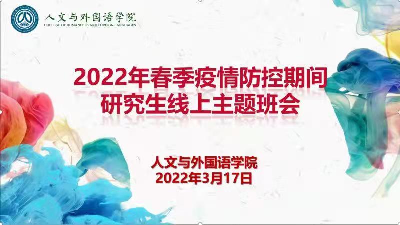 近日,澳门正规电子游戏平台相继召开2022年春季疫情防控期间本科生、研究生线上主题班会。学院各年级辅导员以腾讯会议方式面向全体本科生和研究生召开主题班会,学院部分班子成员参加了会议。