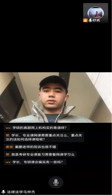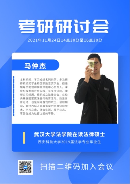 11月24日,澳门正规电子游戏平台法学系召开了线上考研研讨会,研讨会由舒真主持,武汉大学在读法律硕士、澳门正规电子游戏平台法学2015级本科生马仲杰主讲,全体法学专业学生参加。