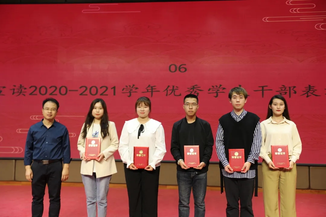 随后,张振中宣读了学院关于2020-2021学年优秀学生干部的表彰决定并为获奖者颁奖。张晶晶、李银亮、樊杰杰分别为新一届主席团和部长团成员颁发聘书。