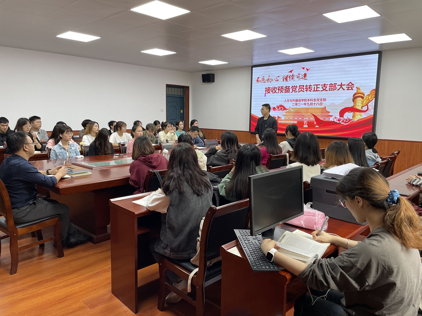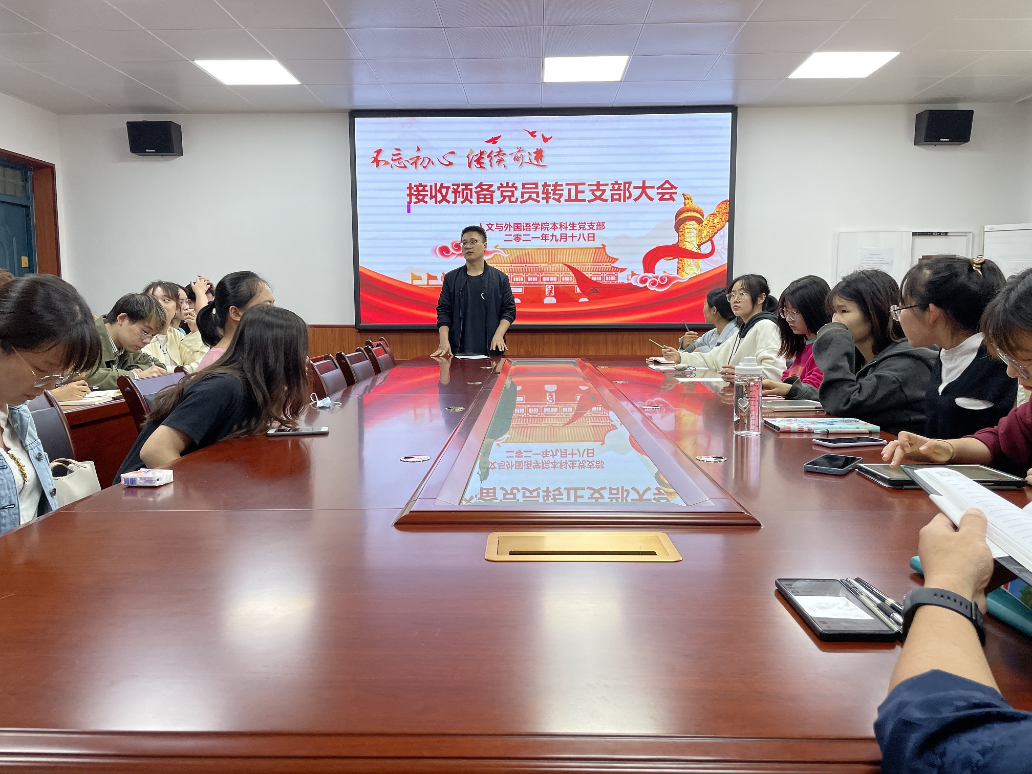 9月18日上午,澳门正规电子游戏平台本科生党支部于二教226会议室召开接收预备党员转正支部大会。院党委副书记张振中及党支部全体成员参加了此次会议,本次会议由学院本科生党支部书记李银亮主持。会上,李亮亮、石海廷、韦雪、黄运鹏四位同志就自身的学习、生活和工作等方面的情况做了陈述。随后,樊杰杰同志传达了党组织意见,同意四位同志成为正式党员。接着其他各位同志依次发言,谈了四位同志在学习、生活等多各个方面的情况。 接收工作结束后,张振中对支部成员做出了殷切的期望:“作为人文学院的学子,要做一个既优雅高贵又温暖四方的人,作为一名学生党员,则更要成为一个为人民服务的人。”