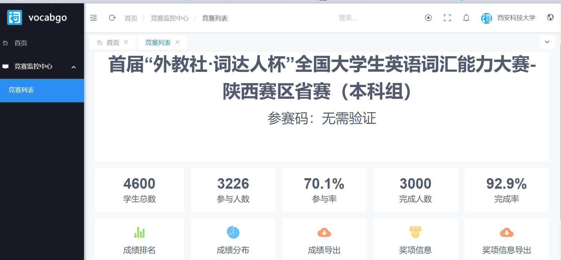 此前,澳门正规已经完成了线上模拟赛,校园选拔赛以及陕西赛区复赛的线上赛组织工作。初赛阶段,澳门正规共有3500名学生参加,经过激烈竞争,有200名学生进入陕西赛区复赛。复赛阶段澳门正规共有91名选手进入首届“外教社·词达人杯”全国大学生英语词汇能力大赛全国总决赛。