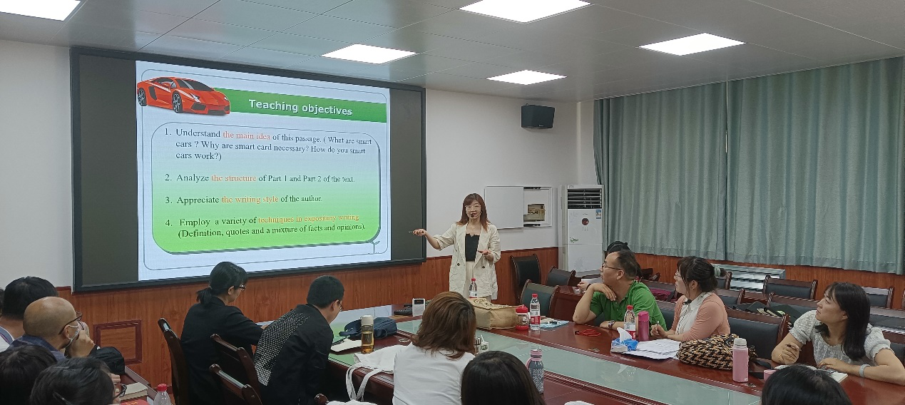 张彩虹、喻鑫、吉科利和张军锋分别对The Pursuit of Dreams, Smart Cars, The Last Leaf以及A Friend in Need进行了教学展示。随后魏羽教授、吴敏焕副教授、付科峰副教授等14位老师作为同行专家从课程思政、教学思路、教学方案、教学内容以及教学形式等方面进行了点评,并提出了中肯的改进意见。