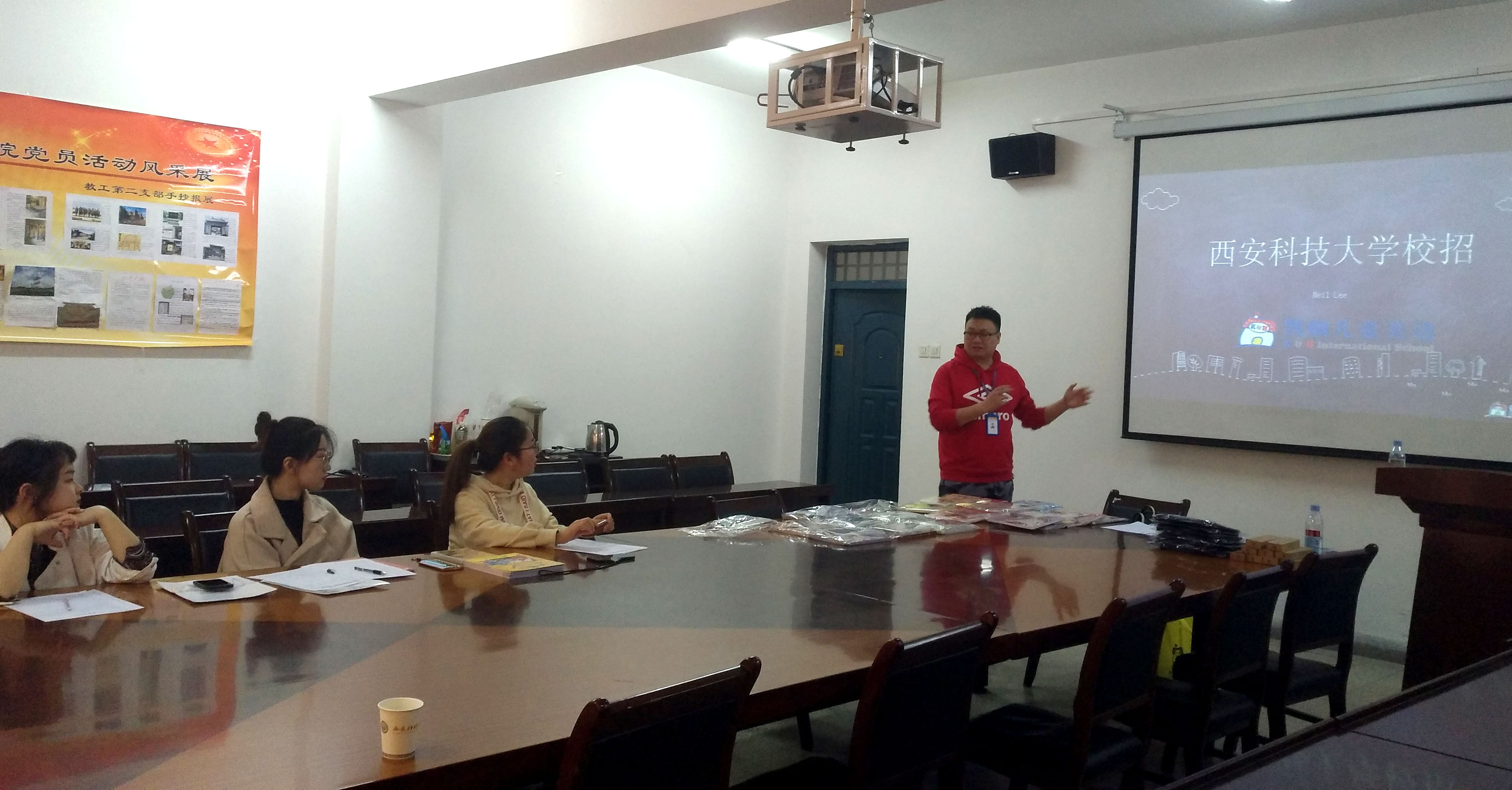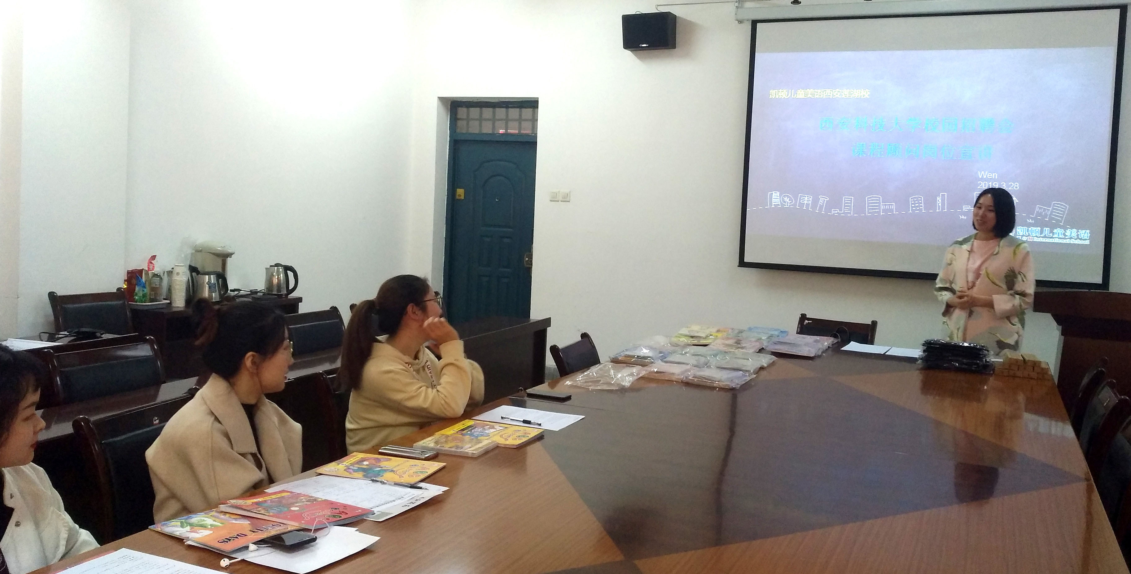 英语系副主任张建昌主持招聘会,并与凯顿儿童美语西安校区负责人就学生就业、单位需求、实习实践教学等内容进行了交流,就进一步加强校企合作、提高学生实践能力为学生就业提供指导和平台等方面初步达成共识。