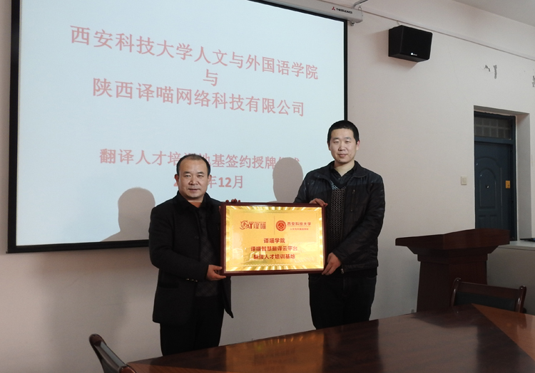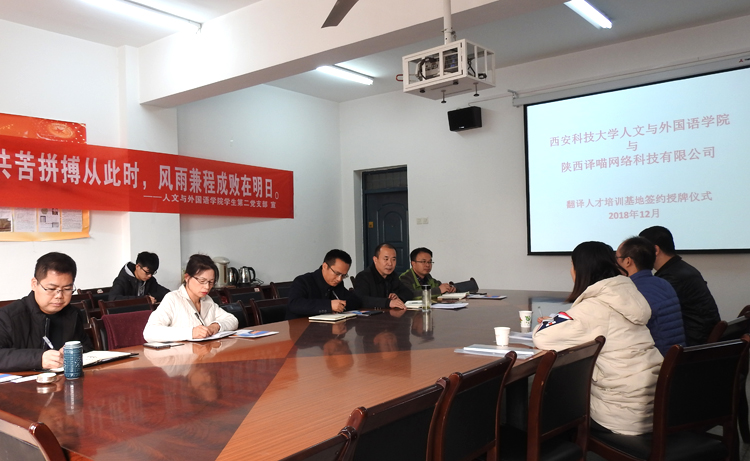12月5日下午,澳门正规电子游戏平台与陕西译喵网络科技有限公司翻译人才培训基地签约授牌仪式在学院会议室举行。陕西译喵网络科技有限公司总经理王潇轩,澳门正规电子游戏平台院长师新民分别代表双方签订合作协议。学院党委副书记张振中、副院长冯正斌及英语系教师代表参加签约授牌仪式。