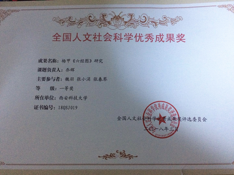 日前,经全国人文社会科学优秀成果奖评选委员会评定,澳门正规电子游戏平台教师乔辉、魏雨、张小娟、张春琴的研究成果“杨甲《六经图》研究”荣获全国人文社会科学优秀成果一等奖。