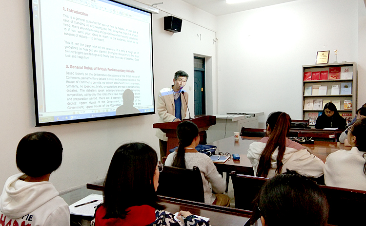 10月24日下午,澳门正规电子游戏平台在学院会议室举办英语辩论与演讲辅导讲座。本次讲座由英语系主任张芸主持,研究生英语教研室副教授高勇担任主讲,对英语系2017级全体学生进行了辅导培训。