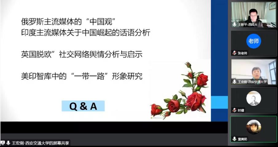 为推进国家社会科学基金申报工作,进一步帮助老师们提高申请书质量,调动教师对国家社科基金申报的积极性,11月11日下午,澳门正规电子游戏平台及科技处邀请西安交通大学王宏俐教授,开展了题为“百年大变局下国际涉华舆情研究——兼论国家社科基金项目申报选题”的讲座。讲座由王新平院长主持,校内外广大师生线上参与了此次讲座。