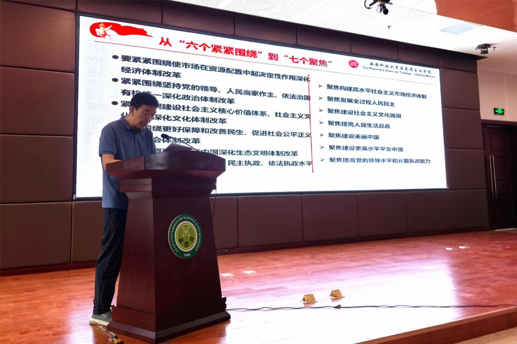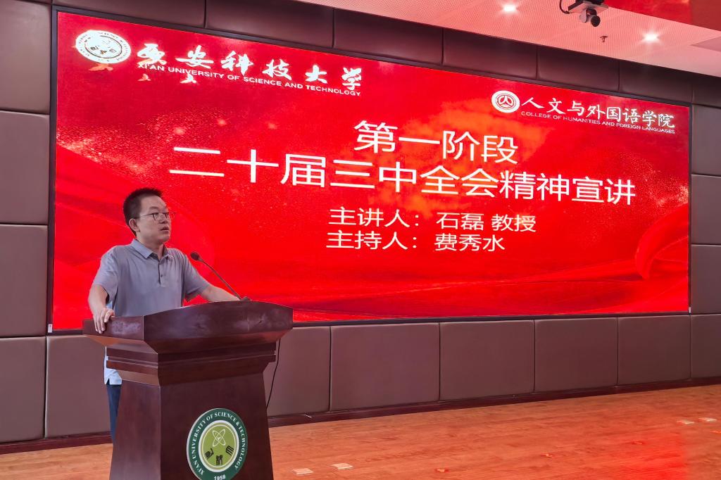 9月10日下午,人外学院在临潼校区骊山校园煤炭科技中心二楼报告厅召开党的二十届三中全会精神宣讲报告会,马克思主义学院博士生导师石磊教授应邀作全会精神宣讲。学院全体教职工参会,报告会由学院党委书记费秀水主持。