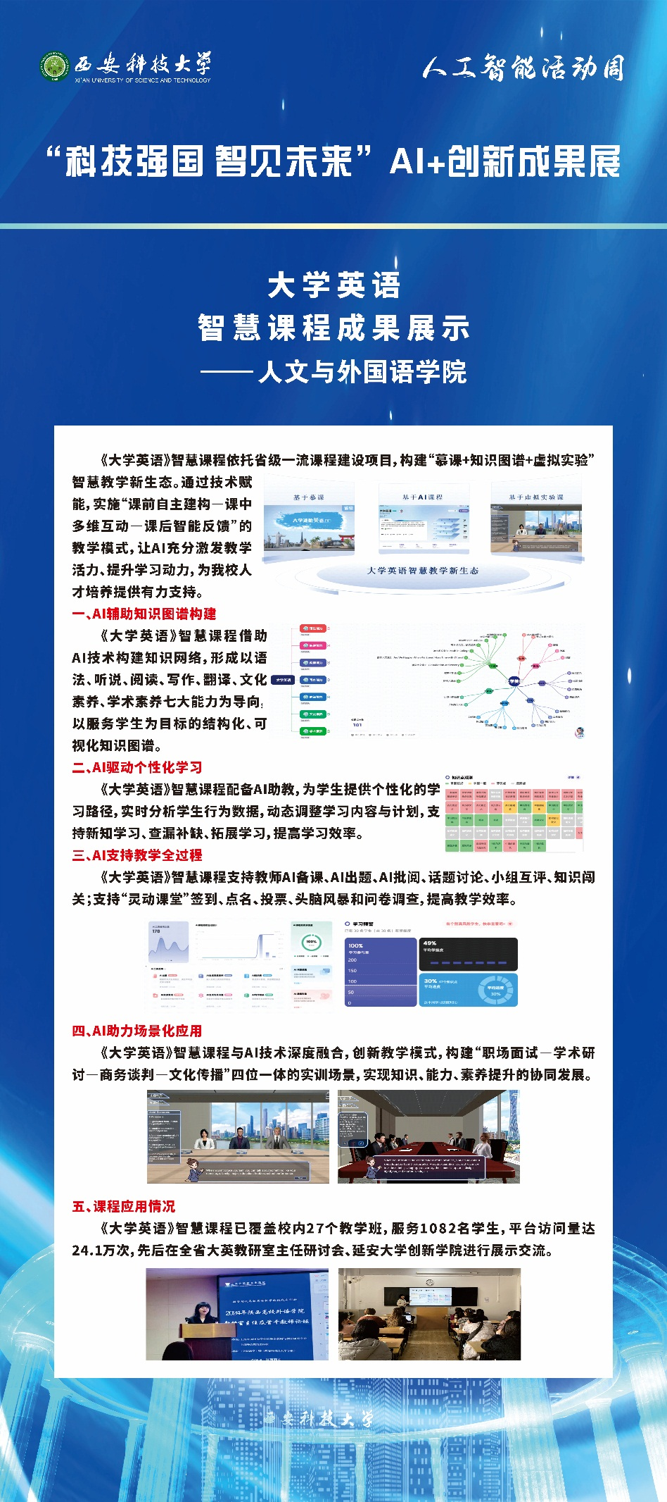 为深入贯彻落实习近平总书记关于加快人工智能发展的重要指示批示和全国教育大会精神,深化AI赋能高质量教育教学改革,推动人工智能发展与学科专业交叉融合,展现澳门正规AI+教育教学创新成果,澳门正规“科技强国·智见未来”人工智能活动周系列活动自5月1日启动,澳门正规电子游戏平台遴选《大学英语》智慧课程参加本次活动周展出。