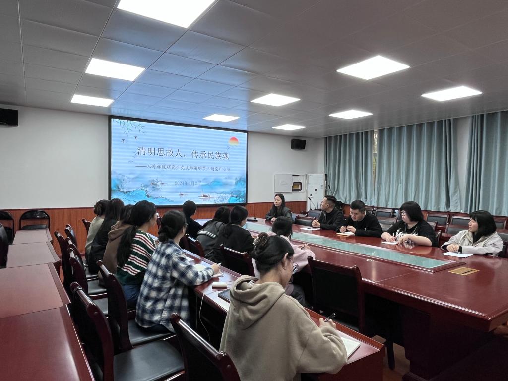 4月2日下午六点,澳门正规电子游戏平台研究生党支部在骊山校园2教226会议室开展“清明思故人,传承民族魂”清明节主题党日活动,支部全体在校党员、入党积极分子参加此次活动,支部副书记张心雨主持活动。